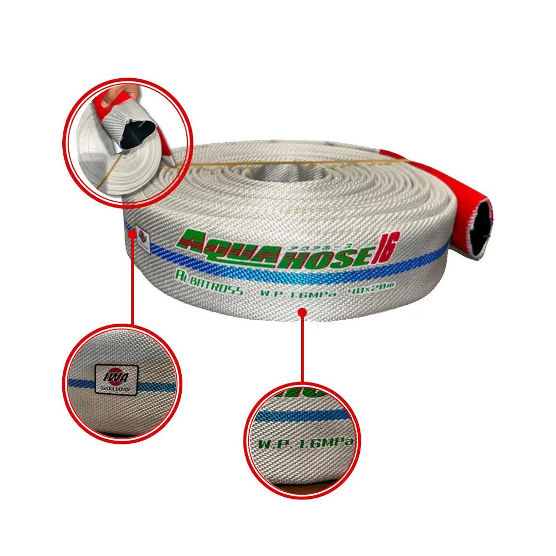 3. Tekanan Kerja Optimal (Working Pressure 16 Bar) Iwa Japan AQUA HOSE dirancang untuk beroperasi pada tekanan kerja 16 bar. Kemampuan menahan tekanan tinggi ini menjamin aliran air yang kuat dan stabil, sehingga sangat penting untuk mencapai target api dari jarak jauh atau memadamkan kebakaran yang intens.